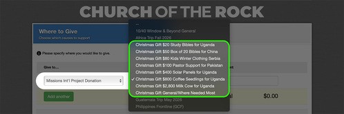 Once you have logged in, go to "Give Now" and under the heading "Give to..." select "Missions Projects (International)" and then select the type of gift and then enter the amount you have decided.